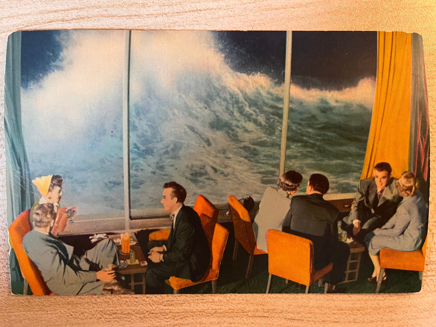 In the dream I am standing with residents in a dining room with windows that overlook the sea. As I am standing there watching the tide rise, it engulfs us, but we are watertight, safe. My ever present and laconic inner narrator suggests that it is the proximity to the residents that has guaranteed safety. The wise person builds their house upon a rock, right? I’ve had a version of this dream once before in which a glass shattering vacuum, a black hole I imagine, is pulling me down a nursing home hallway and out into the impersonal stars when a yellow-gloved housekeeper, a woman that I know, simple and honest, works there with her daughter, takes my hand and forestalls the destruction, a one-woman, Bible-believing, clean-up crew and I’m no longer inhaling glass.
